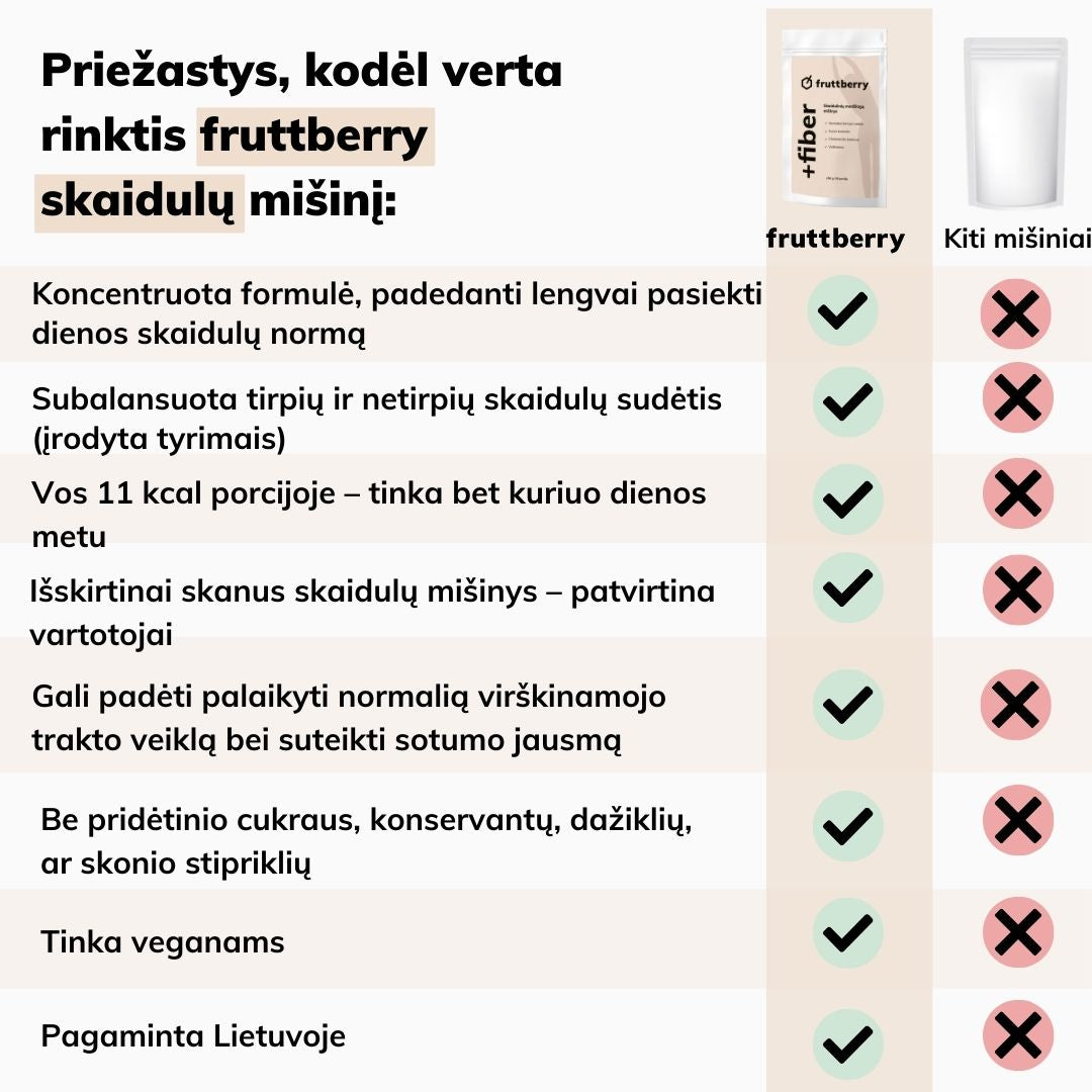 fruttberry +fiber skaidulų mišinio sudėtyje: