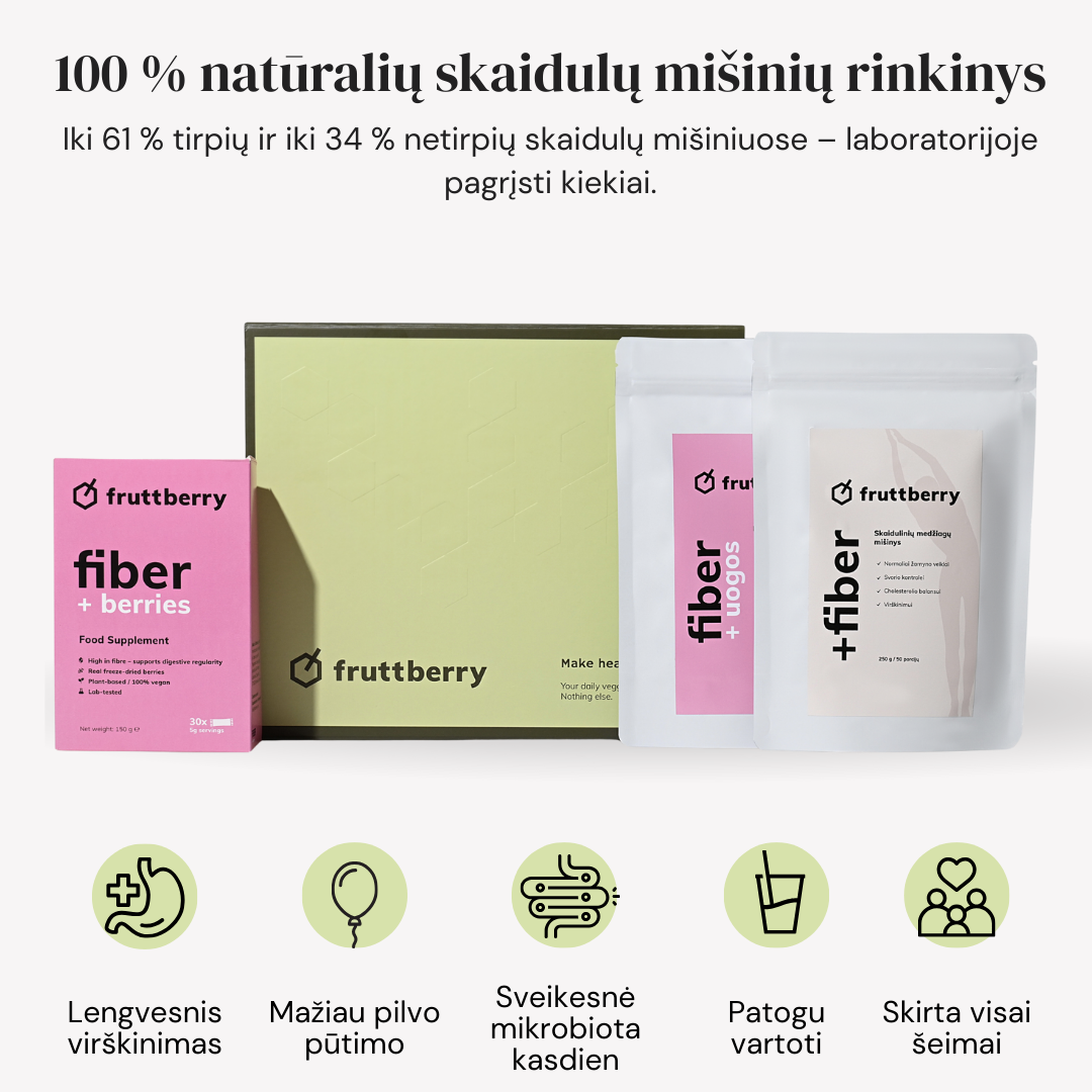 fruttberry skaidulinių medžiagų mišinys +fiber, sudėtyje taip pat yra net 31 skirtingos daržovės, vaisiai, uogos ir adaptogenai, praturtinantys mišinius skaidulomis, vitaminais, mineralais ir antioksidantais.