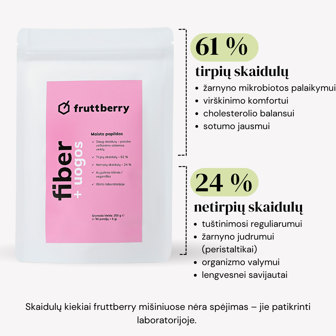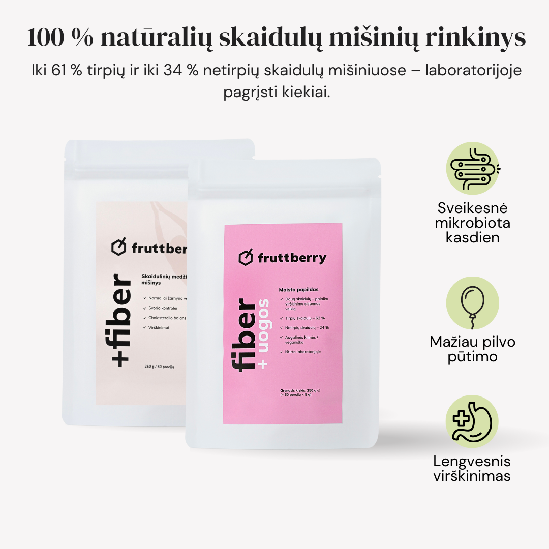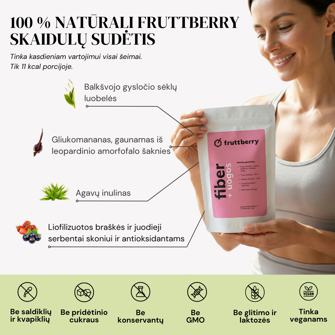 The mixture contains natural ingredients such as white plantain, agave inulin, glucomannan from leopard amorphophallus root extract, and over 40 different fruits, berries, vegetables, adaptogens, antioxidants, and other ingredients found naturally in nature. The mixture is made in Lithuania, taking into account the recommendations of nutritionists.